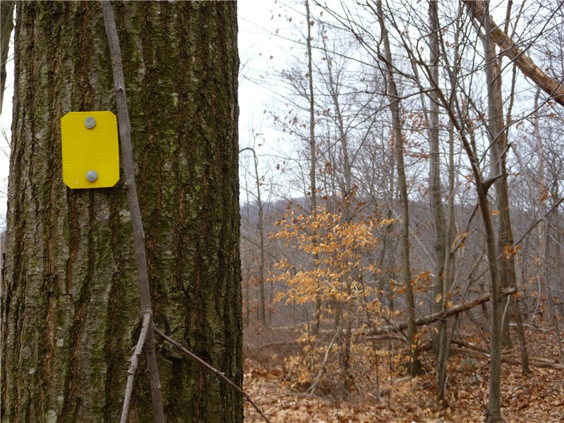 From the hiker parking lot on Diltz Road, take the red dash on white trail beyond the barrier.