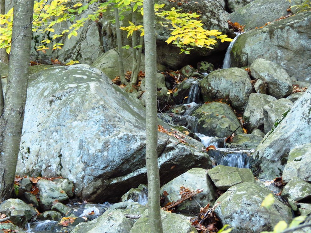 | The yellow-blazed trail runs along scenic Stony Brook. |