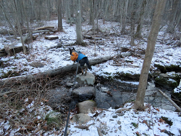 | Joining in with orange briefly to cross Burnt Meadow Brook on a dirt road bridge. |